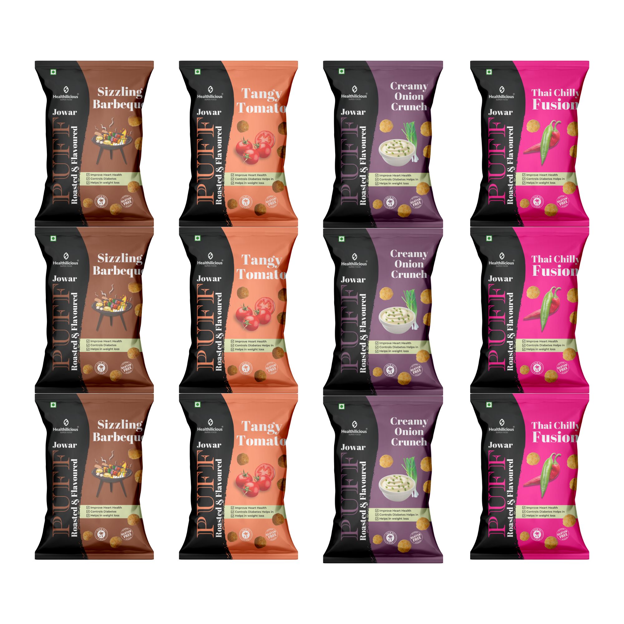 Roasted Jowar Puff | Pack of 3 Sizzling Barbeque | Tangy Tomato | Thai Chilly Fusion | Creamy Onion Crunch Flavour | Millet Snacking Combo Pack of 12 | 27gm