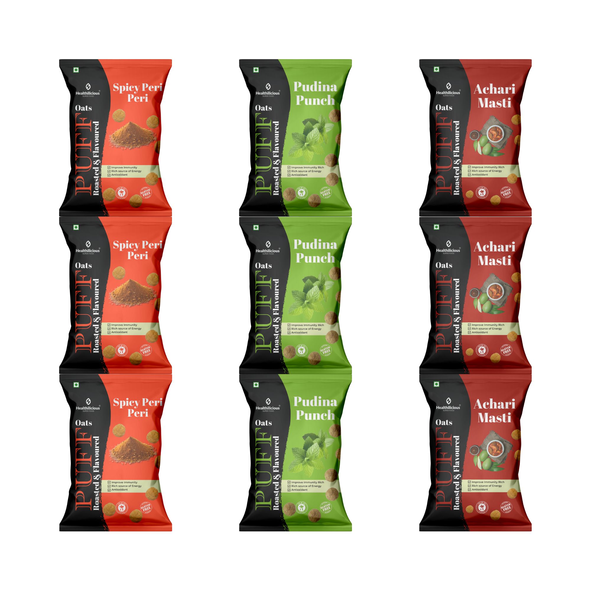 Roasted Oats Puff | Pack of 3 Spicy Peri Peri | Pudina Punch | Achari Masti Flavour | Millet Snacking Combo Pack of 10 | 27gm